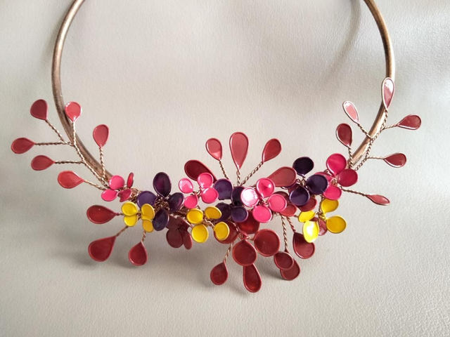 Chaque bijou de mur est une pièce unique, fabriquée à la main avec soin à partir de matériaux recyclés. Le cercle en laiton a été chiné et upcyclé, les petites fleurs sont façonnées à la main sur du fil de cuivre recyclable pour créer une structure délicate qui encadre le cercle. Nous avons utilisé des vernis recyclés issus de fins de séries, pour ajouter des touches de couleurs vives appliquées à la main avec précision.